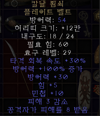 방어력: 56 - 63 요구 레벨: 51 필요 힘: 50 내구도: 14 허리띠 크기: +12칸 대상 감속 10% 적 처치 시 마나 +2 적중당 생명력 5-7% 훔침 (변동) 힘 +15 공격 속도 +10% 시야 -3 |