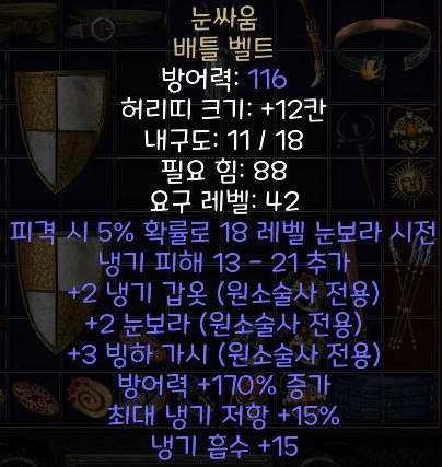 방어력: 2 요구 레벨: 7 내구도: 12 허리띠 크기: +4칸 마나 재생 +30% 모든 저항 +5 마나 +15 시야 +1 |