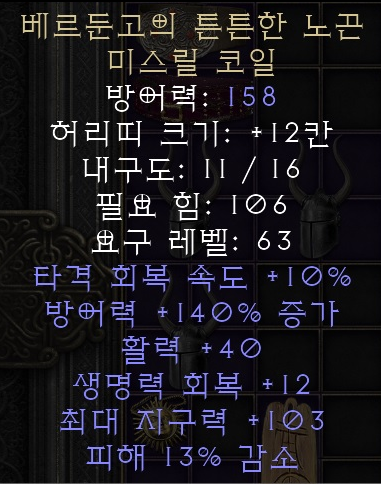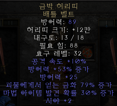 방어력: 34 - 36 (기본 방어력: 6) 요구 레벨: 27 필요 힘: 45 내구도: 18 허리띠 크기: +8칸 방어력 40-60% 증가 (변동) 방어력 +25 공격 속도 +10% 마법 아이템 발견 확률 30% 증가 괴물에게서 얻는 금화 50 - 80% 증가 (변동) 시야 +2 |